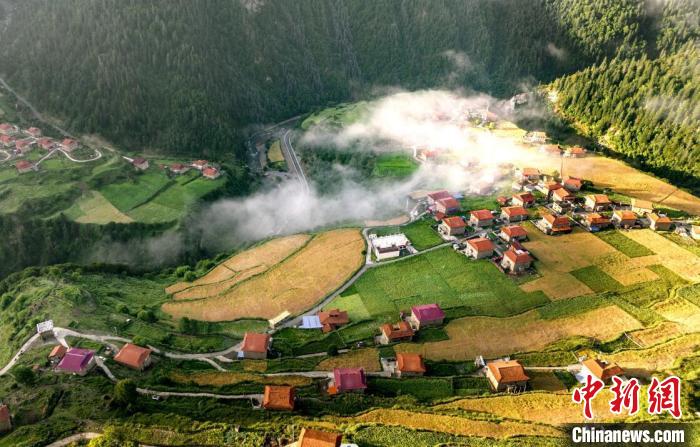 金色的青稞、鄉(xiāng)村及遠山相映成趣,構(gòu)成一幅鄉(xiāng)村田園畫卷。楊正紅 攝