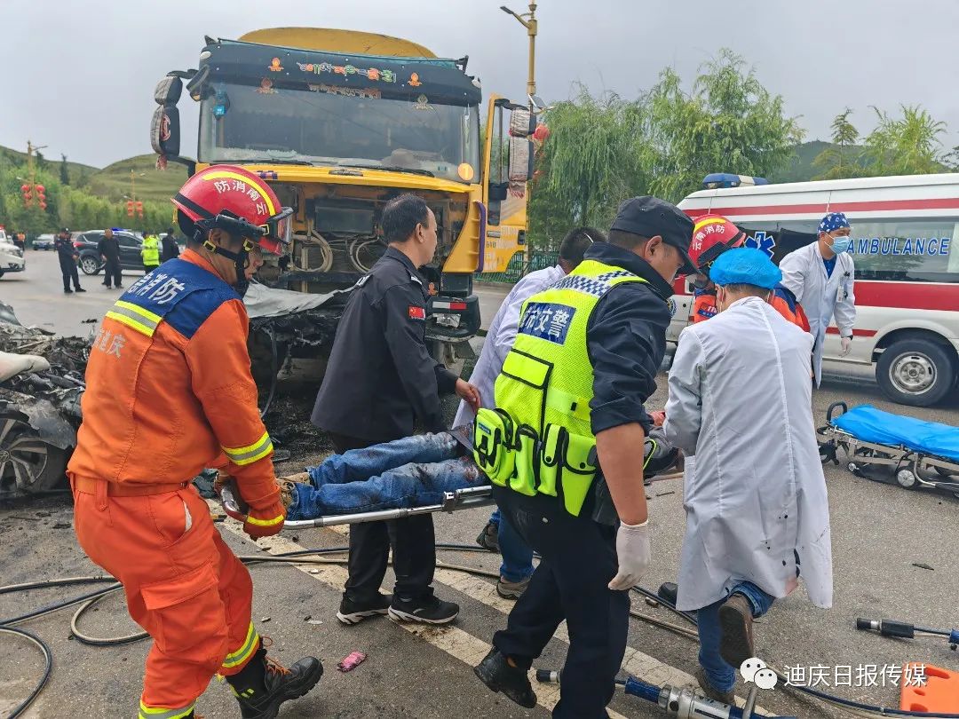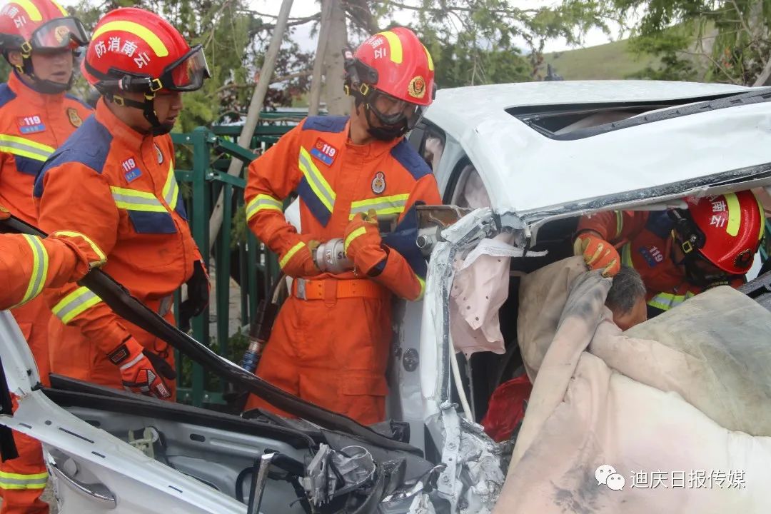 接到調(diào)令后,香格里拉消防救援站立即出動2車13人前往處置,到達(dá)現(xiàn)場后,發(fā)現(xiàn)一輛小轎車與一輛貨車相撞,轎車嚴(yán)重受損變形,車內(nèi)安全氣囊已彈出,副駕駛位被困人員頭部、腿部多處受傷無法動彈,意識模糊,有嚴(yán)重生命危險。
