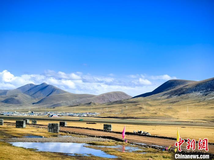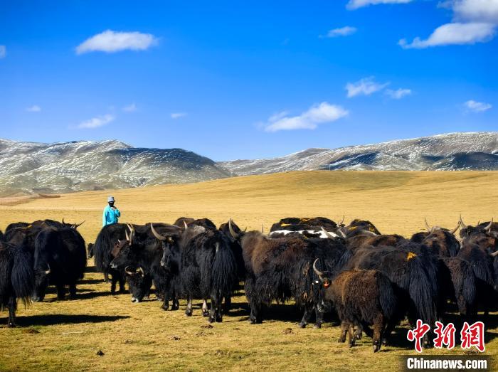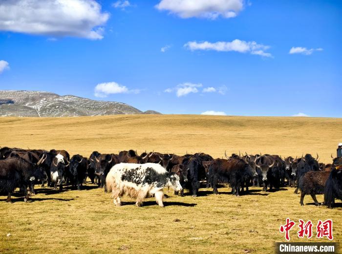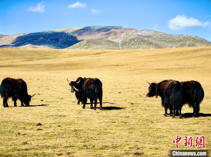 9月20日,青海省玉樹藏族自治州曲麻萊縣生態(tài)牧場牧草已逐漸泛黃。藍(lán)天白云下,遼闊的金色草原間,成群的牦牛正悠閑吃草,成為秋日草原一道靚麗風(fēng)景線。