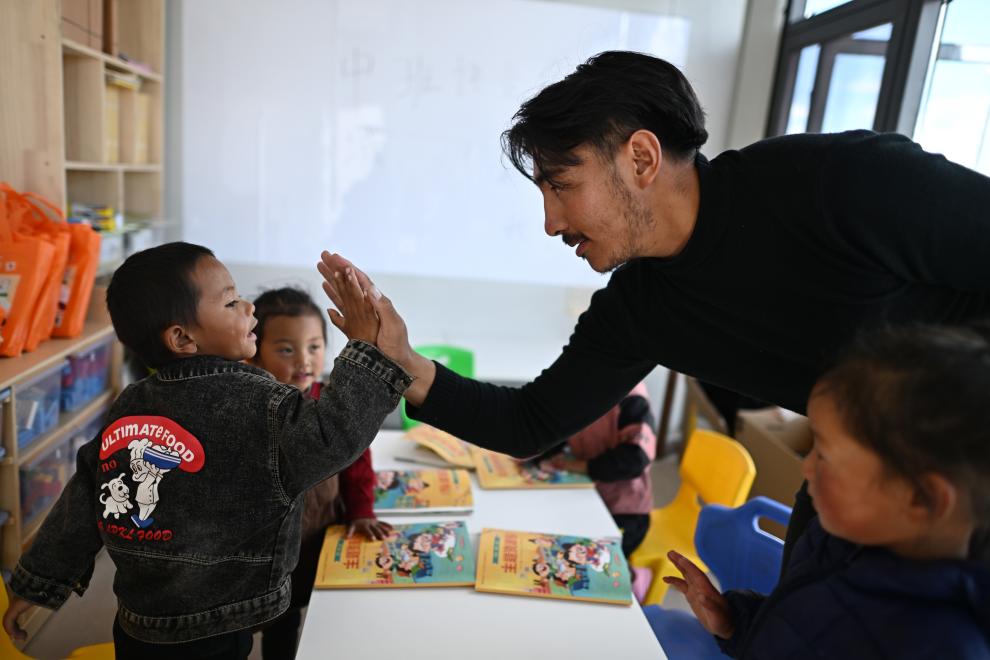在曲麻萊縣秋智鄉(xiāng)布甫村陽光幼兒園,秋智鄉(xiāng)幼兒園副園長才仁戰(zhàn)斗(右二)在課堂上和小朋友互動(dòng)(9月14日攝)。新華社記者 張宏祥 攝