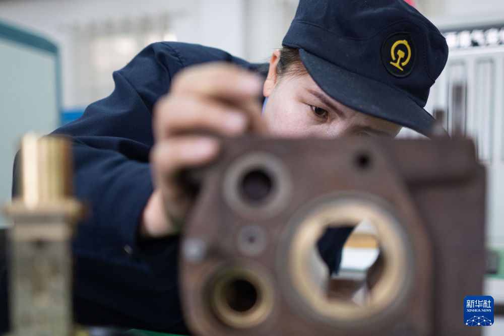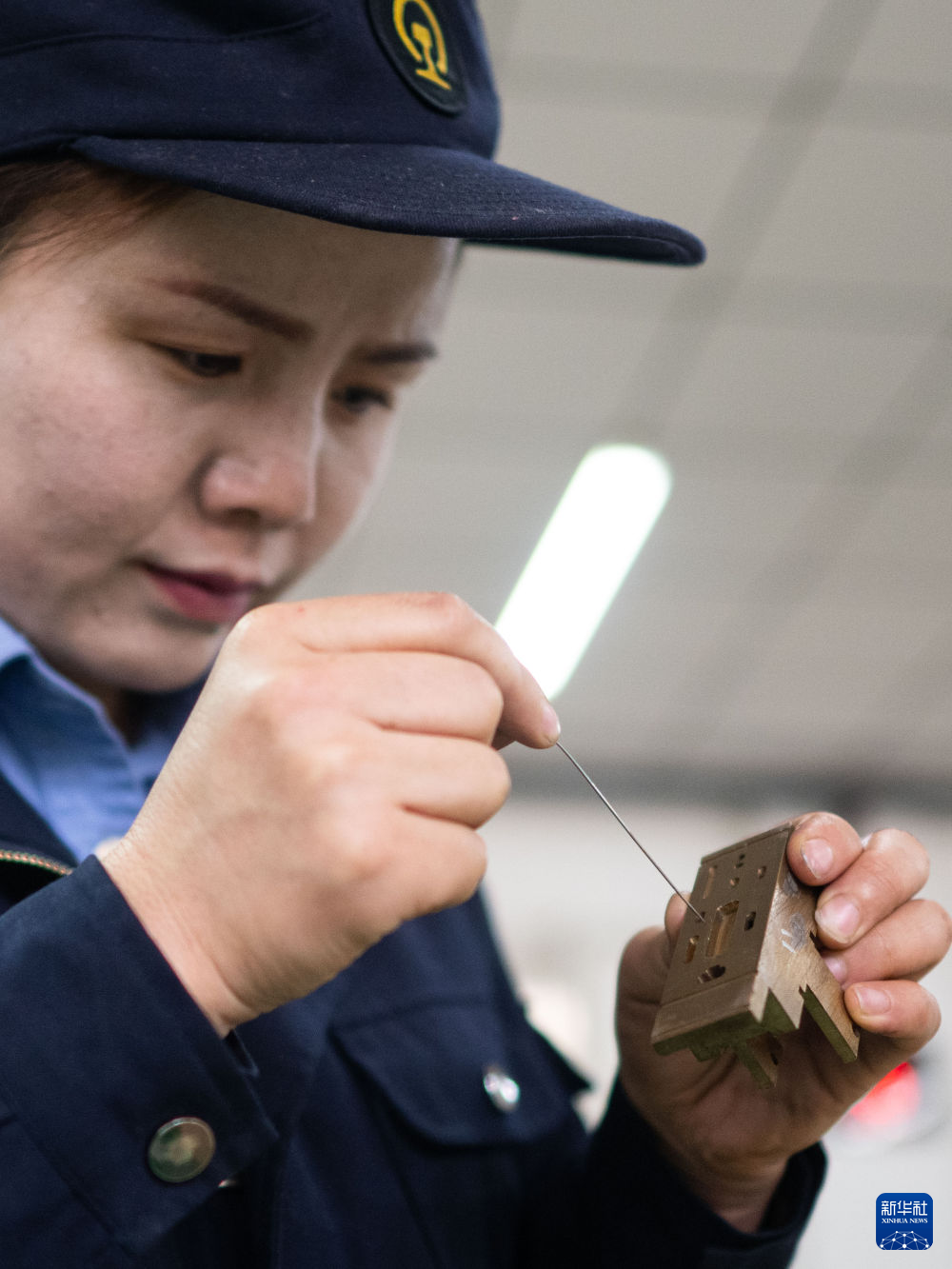 10月12日,在中國鐵路青藏集團有限公司西寧東車輛段制動班組,馬婷對120閥滑閥內(nèi)部通路進行疏通。新華社記者 張龍 攝