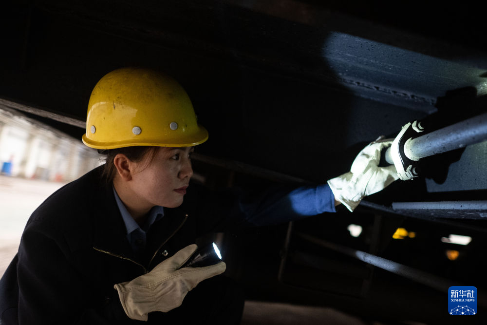 10月12日,在中國鐵路青藏集團有限公司西寧東車輛段制動班組,馬婷在檢查貨車車輛制動主管。新華社記者 張龍 攝