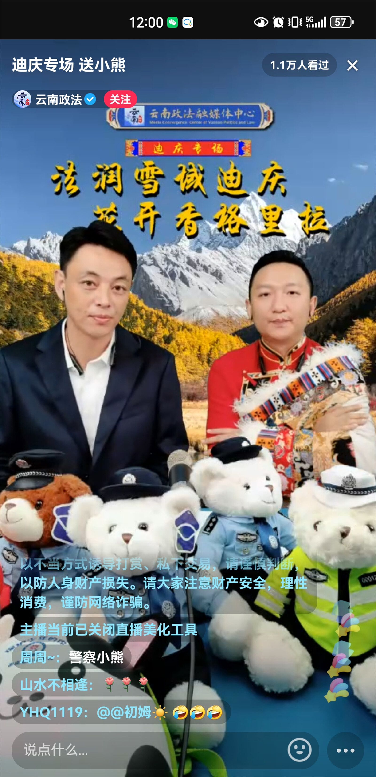 近日,迪慶州政法干警走進(jìn)云南政法普法強(qiáng)基直播間開(kāi)展“法潤(rùn)雪域迪慶、花開(kāi)香格里拉”迪慶州普法專(zhuān)場(chǎng)直播,直播聚焦群眾關(guān)切,緊密聯(lián)系時(shí)事熱點(diǎn),帶廣大網(wǎng)友體驗(yàn)了一場(chǎng)內(nèi)容豐富的普法之旅,共吸引9.1萬(wàn)人觀(guān)看,獲點(diǎn)贊超10.4萬(wàn)。