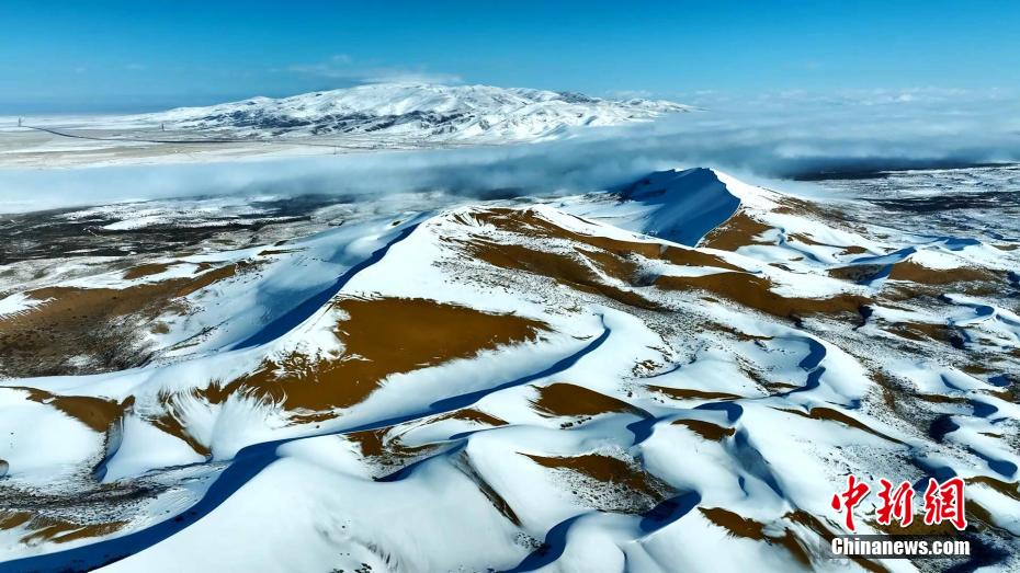 12月中旬,高原青海迎來新一輪寒潮。在青海湖北岸的青海省海北藏族自治州海晏縣,攝影師在金沙灣拍攝到雪落金沙的冬日景色。航拍鏡頭下沙與雪的色彩明暗交錯、波瀾起伏,宛如大自然為大地“咖啡”“拉花”,藍(lán)白交織的純凈讓人心曠神怡。雪后初晴,云河在沙丘間流動,時而隨著氣流“流入”青海湖,沙丘背后的蔚藍(lán)湖水,也讓景色變得奇幻優(yōu)美。青海湖是中國最大的內(nèi)陸高原咸水湖,是維系青藏高原東北部生態(tài)安全的重要水體,也是控制西部荒漠化向東蔓延的天然屏障。