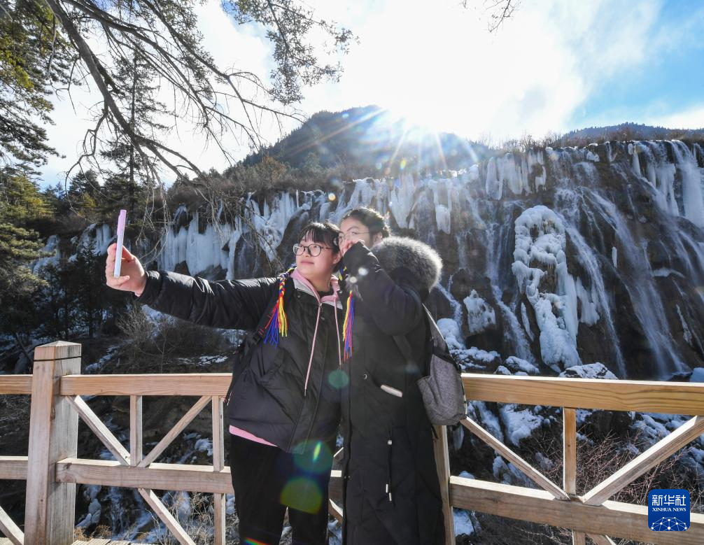 1月4日,游客在九寨溝風景名勝區(qū)冰瀑景觀前留影。新華社記者 王曦 攝