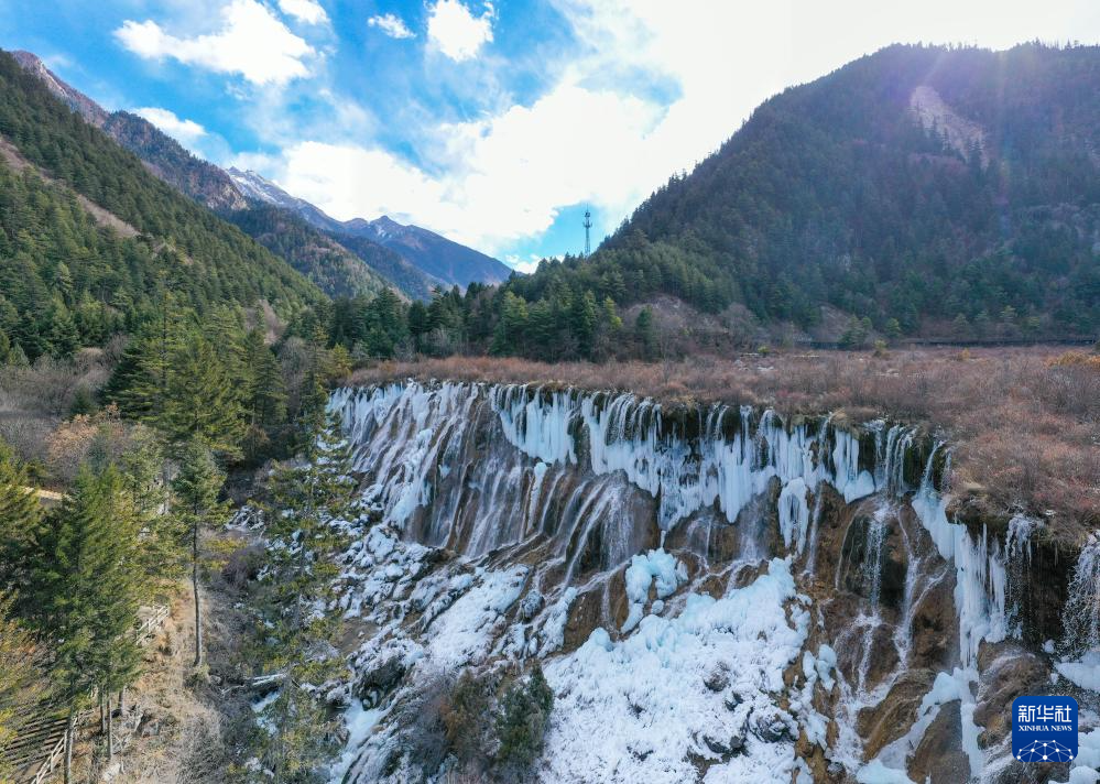 這是1月4日在四川省九寨溝風景名勝區(qū)拍攝的諾日朗瀑布形成的冰瀑景觀(無人機照片)。新華社記者 王曦 攝