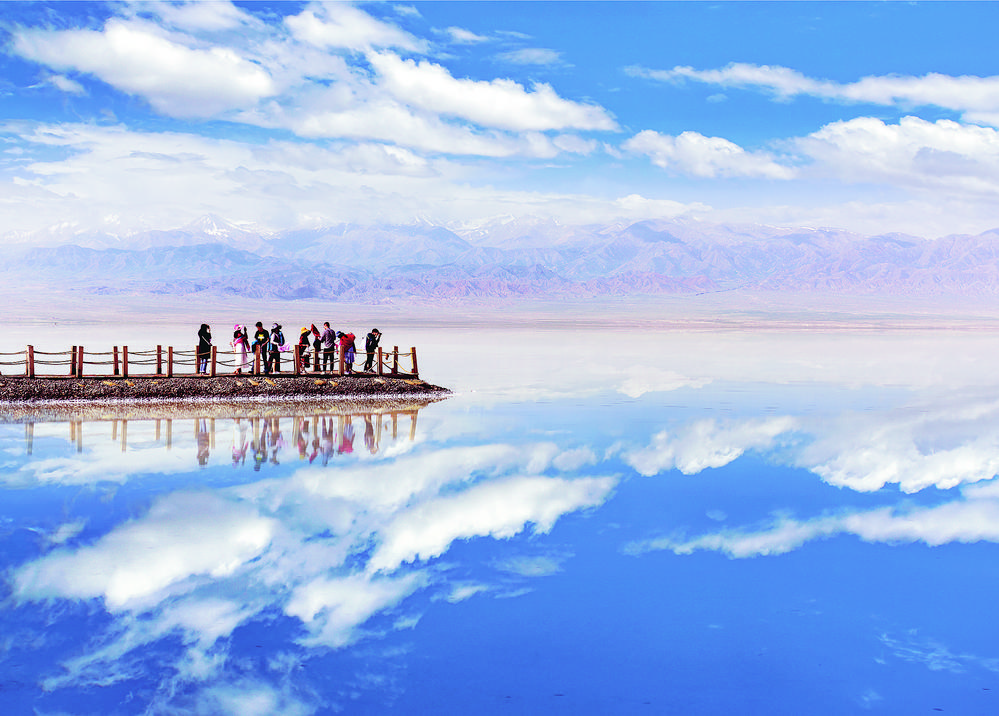 景區(qū)綠化面積達(dá)到4.5萬平方米、濕地栽植面積達(dá)10.1萬平方米、平整土地16.4萬平方米……隨著一系列措施落地生效,茶卡鹽湖生態(tài)環(huán)境持續(xù)向好,階段性生態(tài)效應(yīng)正在顯現(xiàn)。徜徉在鹽湖深處——云,觸手可及;水,共天一色,人與自然構(gòu)成一幅美不勝收的和諧畫卷!