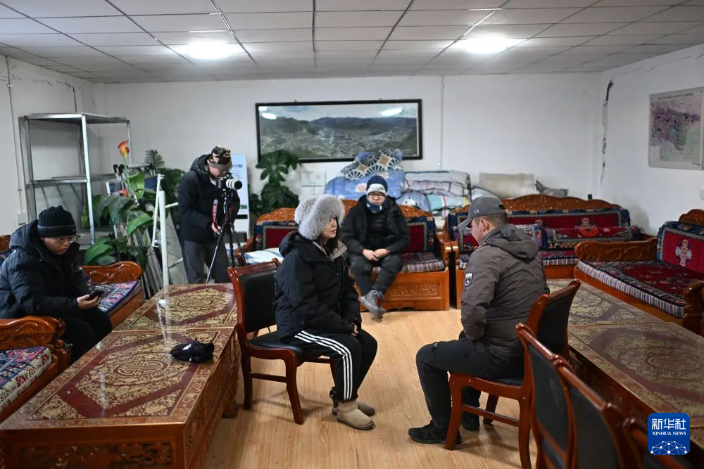 記者在索南達杰保護站宿舍內(nèi)采訪巡山隊員(1月19日攝)。新華社記者 張宏祥 攝