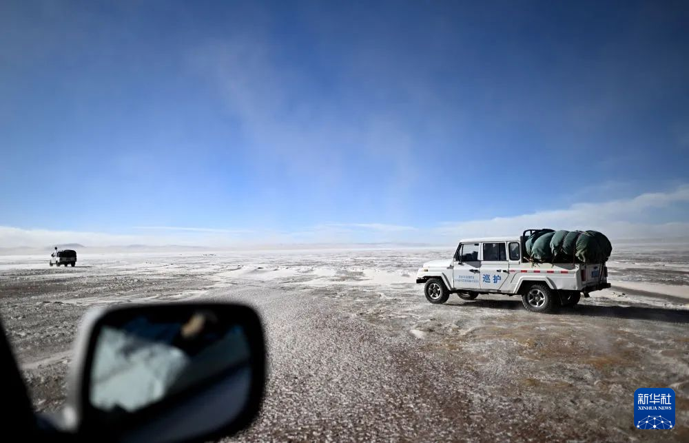 記者看到,當?shù)仫L雪不斷、飛沙走石,道路顛簸曲折。巡山隊員驅(qū)車從可可西里索南達杰保護站出發(fā),途經(jīng)卓乃湖、可考湖等地,對沿線地區(qū)開展常態(tài)化巡檢。隨行車輛配備了帳篷、睡袋、自熱食品等生活物資和必要的急救物資。巡山隊員白天鑿冰取水,晚上則要住在野外的帳篷里。