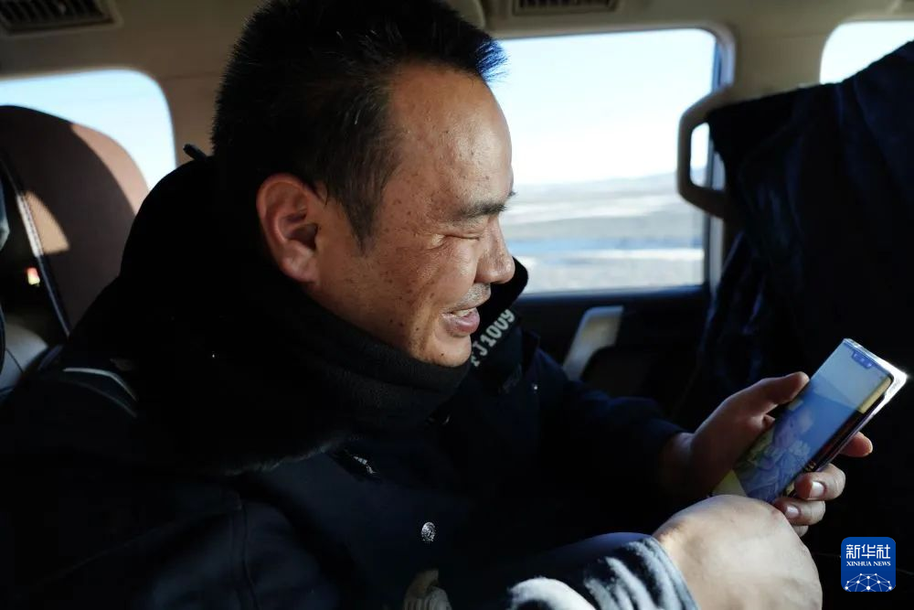 1月19日,巡山隊員袁廣明在可可西里巡山途中,翻看自己孩子的照片。新華社記者 周盛盛 攝