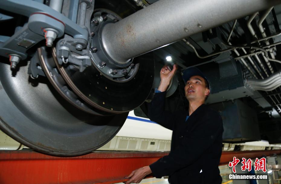 1月30日晚,在青藏鐵路公司西寧車輛段動車運(yùn)用車間,地勤機(jī)械師在無電作業(yè)時進(jìn)行動車組走行部關(guān)鍵部位的檢修。中新社記者 馬銘言 攝