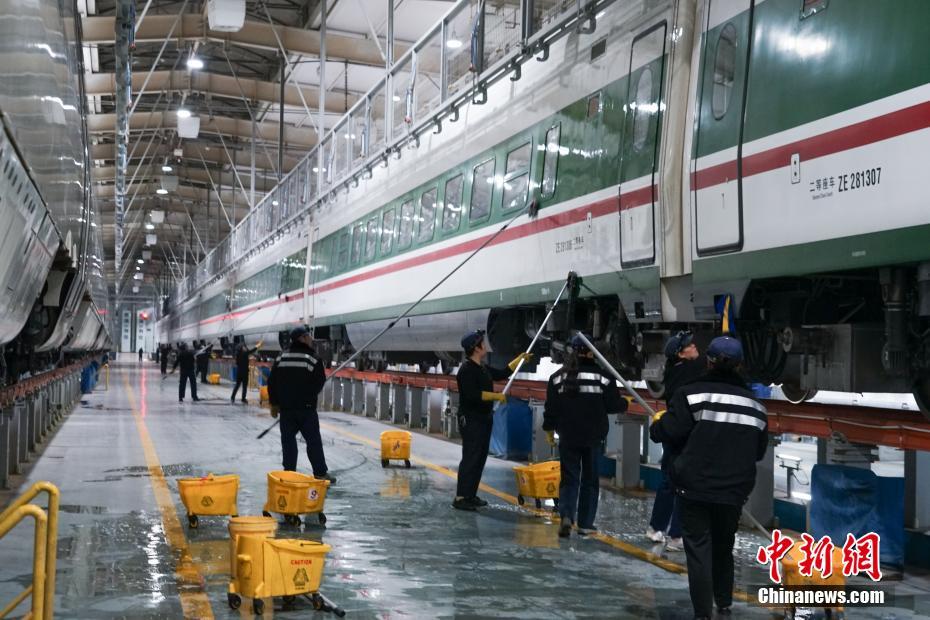 1月30日晚,在青藏鐵路公司西寧車輛段動車運(yùn)用車間,工作人員在無電作業(yè)時進(jìn)行動車清潔。中新社記者 馬銘言 攝