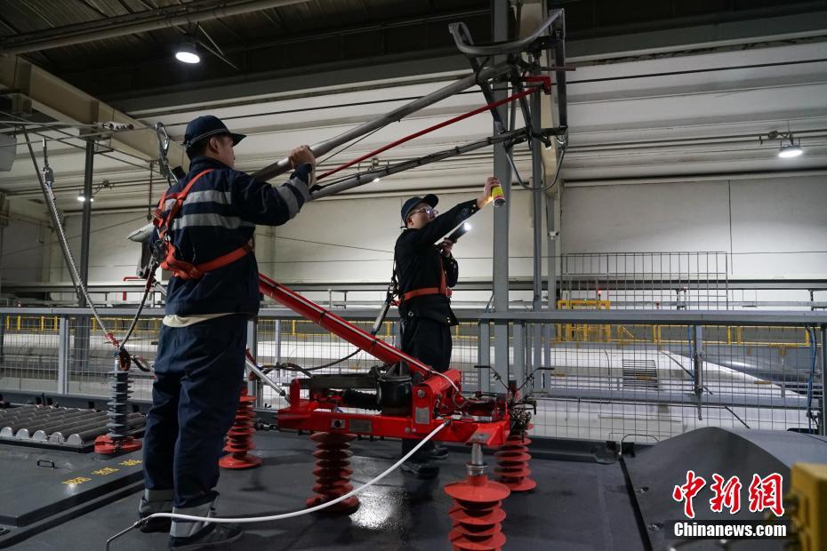 1月30日晚,在青藏鐵路公司西寧車輛段動車運(yùn)用車間,地勤機(jī)械師在無電作業(yè)時進(jìn)行車頂受電弓的功能檢查及測漏檢測。中新社記者 馬銘言 攝