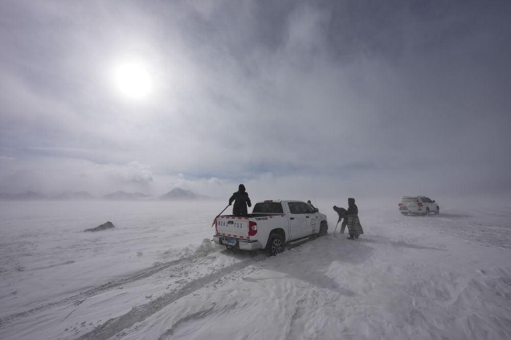 瑪曲鄉(xiāng)長江源黨員環(huán)保志愿隊巡邏途中車輛陷入雪中后進行自救(2024年2月2日攝)。新華社記者 晉美多吉 攝