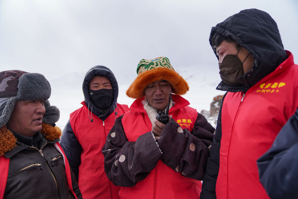 瑪曲鄉(xiāng)長江源黨員環(huán)保志愿隊隊員在巡邏時通過對講機互相聯(lián)系(2024年2月2日攝)。新華社記者 晉美多吉 攝