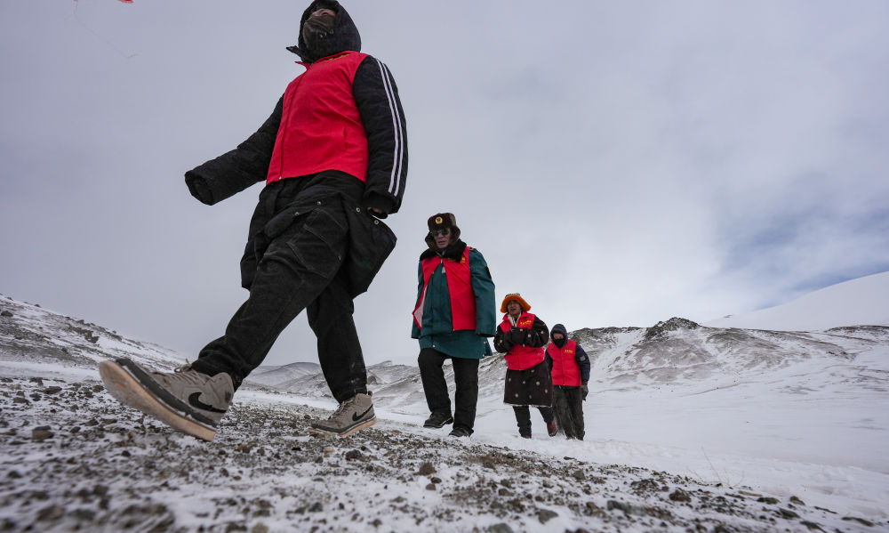 瑪曲鄉(xiāng)長江源黨員環(huán)保志愿隊年近七旬的才嘎老人(右二)在巡邏守護長江源(2024年2月2日攝)。新華社記者 晉美多吉 攝