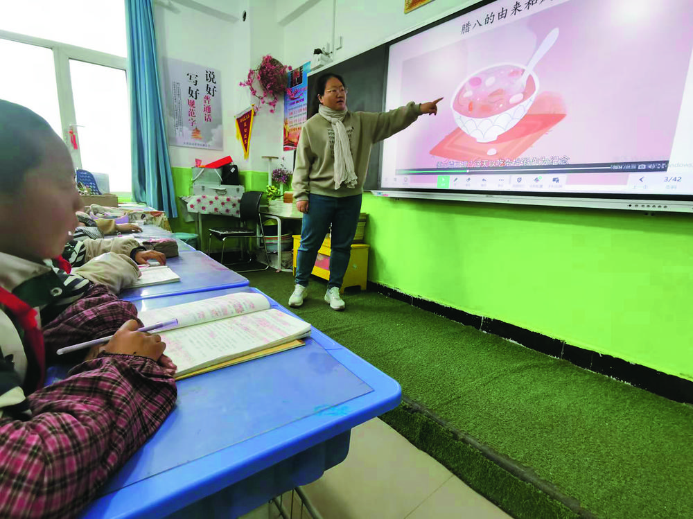 老師解萌萌借助智能黑板,通過視頻給學(xué)生講授中國(guó)傳統(tǒng)節(jié)日和文化。