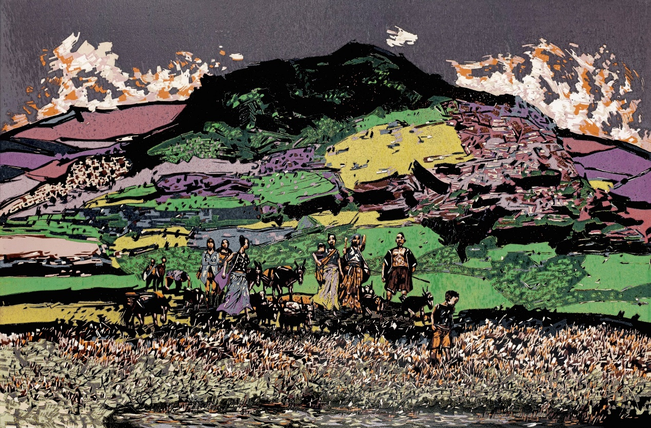 絕版木刻是一種木刻多色套印技法,它突破了傳統(tǒng)套色木刻“一色一版”的制作程序,將一幅畫所有的色版都集中在一塊版上,采用邊刻邊印逐版遞減的創(chuàng)作方式來完成,刻印版畫的過程也是自然毀版的過程,因而被稱為“絕版木刻”。