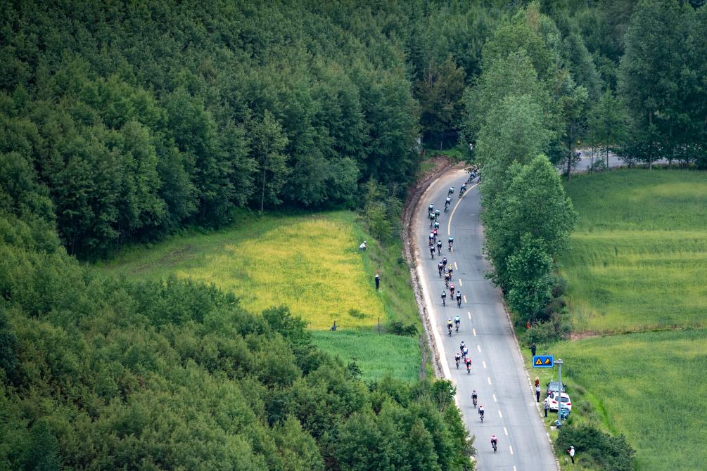 7月9日,參賽選手在第23屆環(huán)青海湖國際公路自行車賽第三賽段互助至貴德的比賽中騎行。新華社 潘彬彬 攝