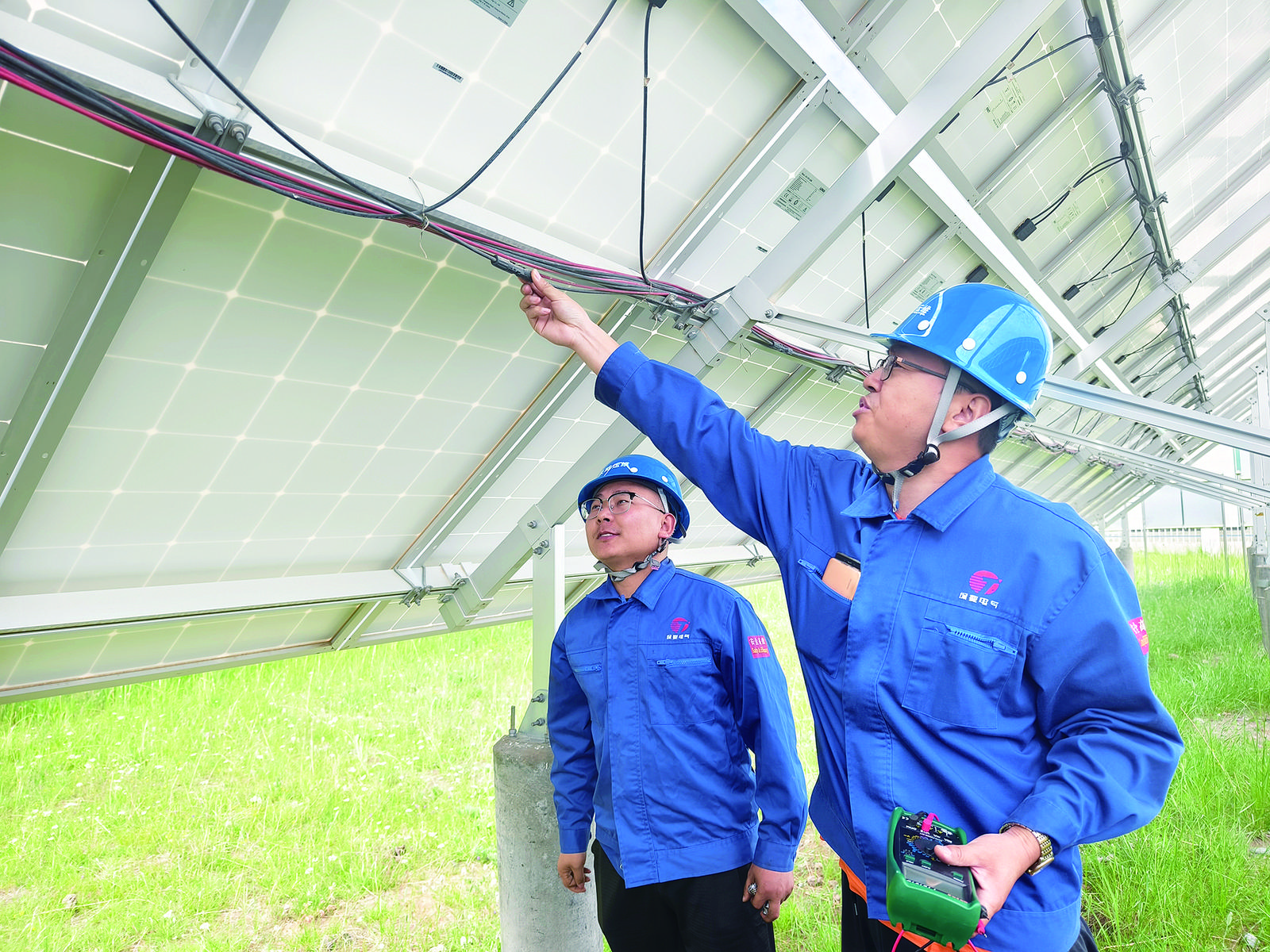 7月19日,記者來到位于青海省海北藏族自治州海晏縣甘子河鄉(xiāng)尕海村的海晏縣興輝光伏扶貧投資有限公司的光伏發(fā)電站時,技術(shù)員劉光耀和王海新正在光伏區(qū)檢查設(shè)備運行發(fā)電情況。