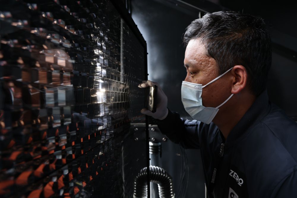 2023年4月21日,工作人員在水切倫科夫探測器陣列三號水池里更換實驗設備。新華社記者 金立旺 攝