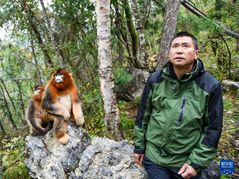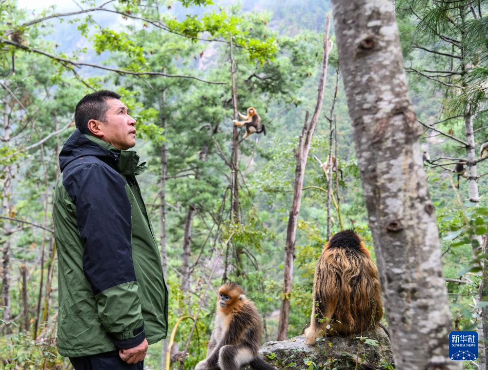 在四川白河國(guó)家級(jí)自然保護(hù)區(qū),唐玉林與川金絲猴互動(dòng)(10月11日攝)。新華社記者 王曦 攝
