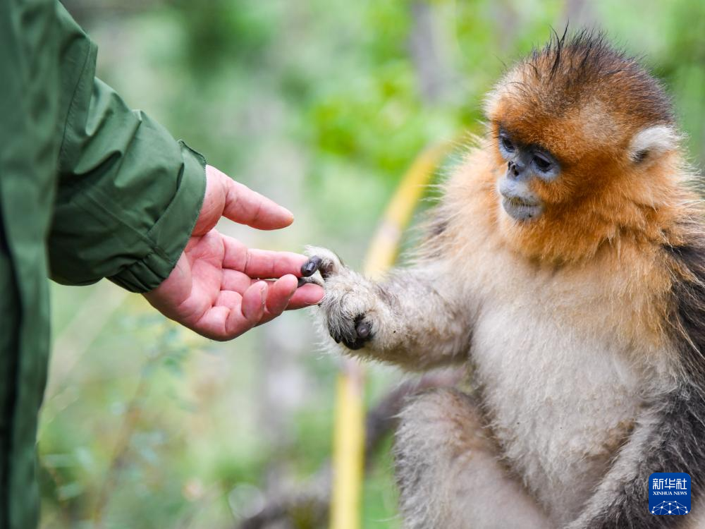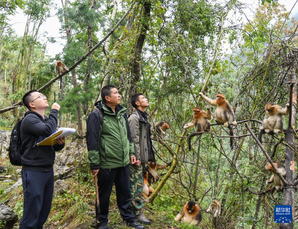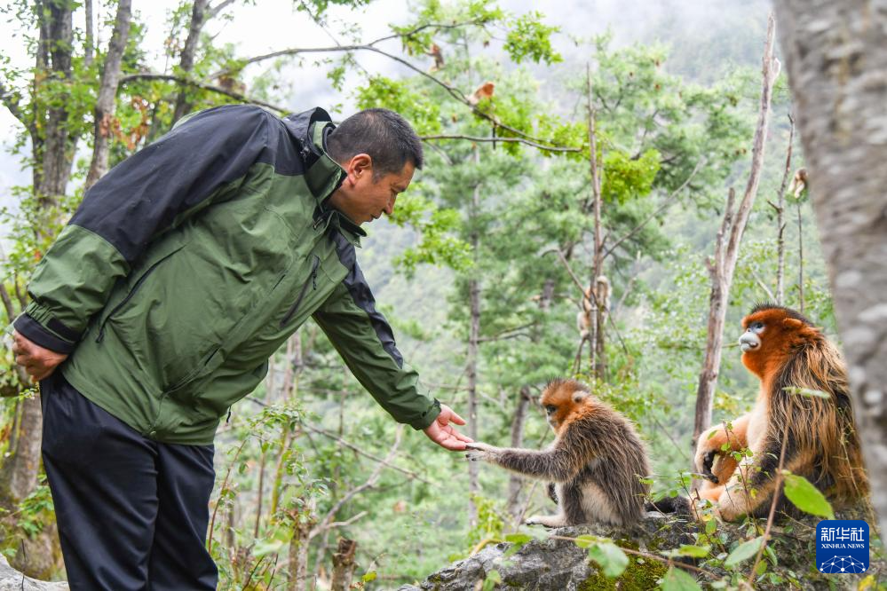 在四川白河國(guó)家級(jí)自然保護(hù)區(qū),唐玉林和川金絲猴互動(dòng)(10月11日攝)。新華社記者 王曦 攝