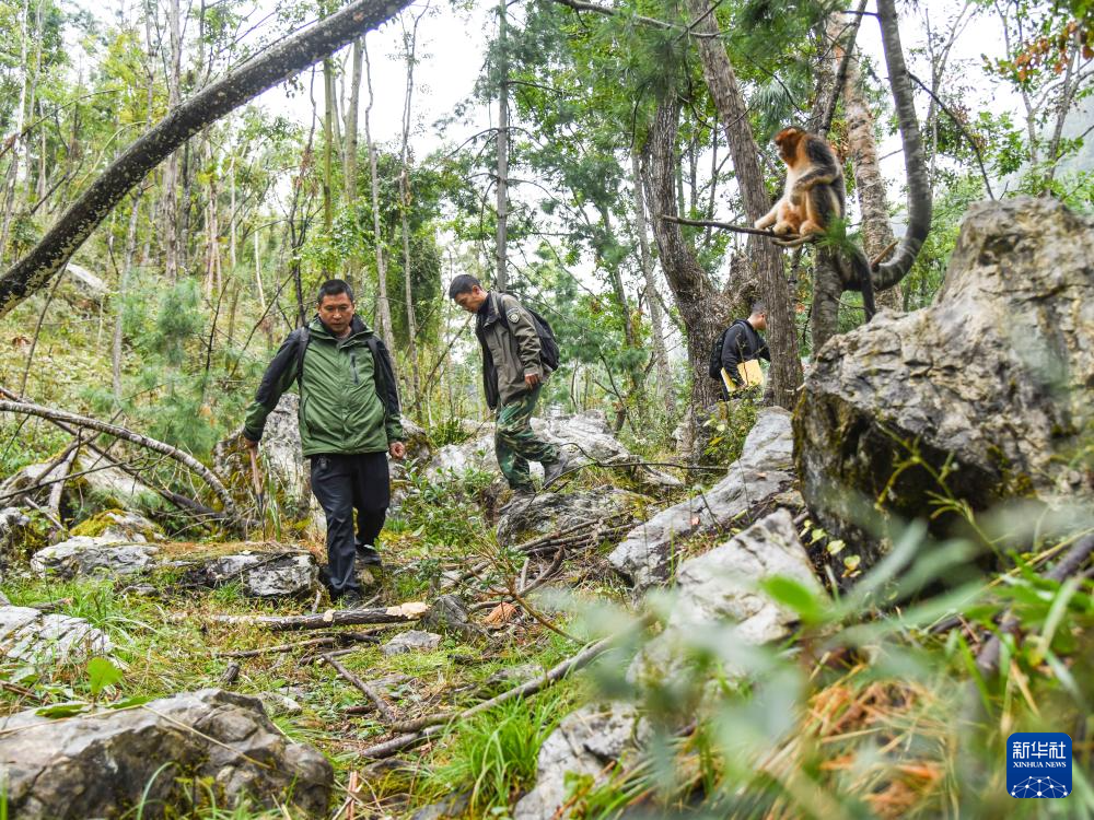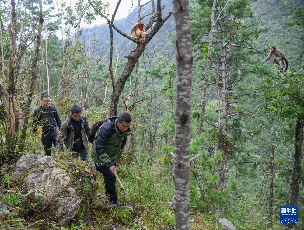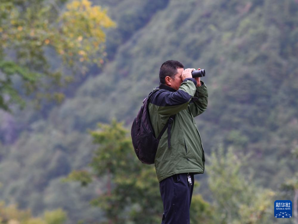 在四川白河國(guó)家級(jí)自然保護(hù)區(qū),唐玉林在觀察川金絲猴活動(dòng)(10月11日攝)。新華社記者 王曦 攝