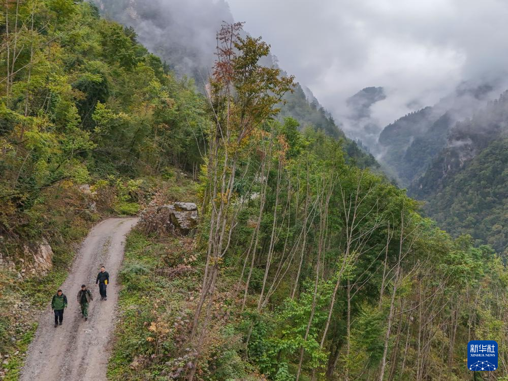 在四川白河國(guó)家級(jí)自然保護(hù)區(qū),唐玉林(左)、侄子唐小剛(中)和西華師范大學(xué)生物學(xué)研究生劉昕走在巡護(hù)的路上(10月11日攝)。新華社記者 王曦 攝