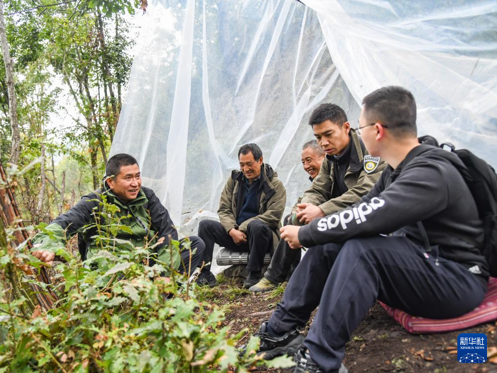 在四川白河國(guó)家級(jí)自然保護(hù)區(qū),唐玉林(左一)和巡護(hù)隊(duì)員一起在搭建的簡(jiǎn)易塑料蓬內(nèi)短暫休息交流(10月11日攝)。新華社記者 王曦 攝