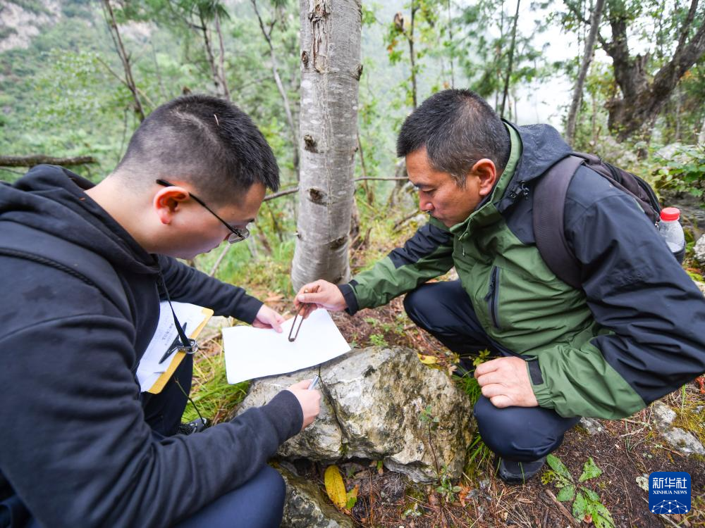 在四川白河國(guó)家級(jí)自然保護(hù)區(qū),唐玉林(右)和西華師范大學(xué)生物學(xué)研究生劉昕在收集記錄川金絲猴的糞便(10月11日攝)。新華社記者 王曦 攝