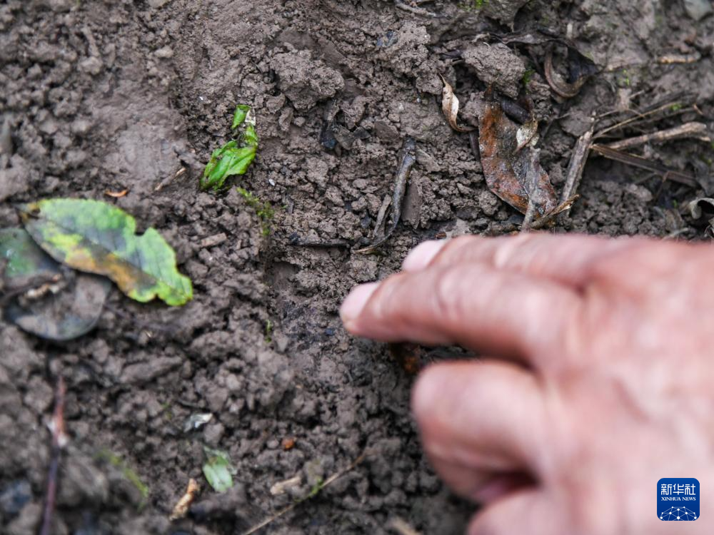 在四川白河國(guó)家級(jí)自然保護(hù)區(qū),唐玉林在巡護(hù)路上發(fā)現(xiàn)毛冠鹿的腳?。?0月11日攝)。新華社記者 王曦 攝