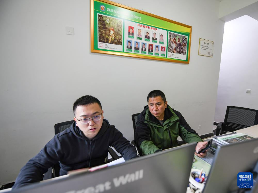 在四川白河國(guó)家級(jí)自然保護(hù)區(qū),唐玉林和西華師范大學(xué)生物學(xué)研究生劉昕在辦公室將巡護(hù)記錄的資料錄入電腦系統(tǒng)(10月11日攝)。新華社記者 王曦 攝