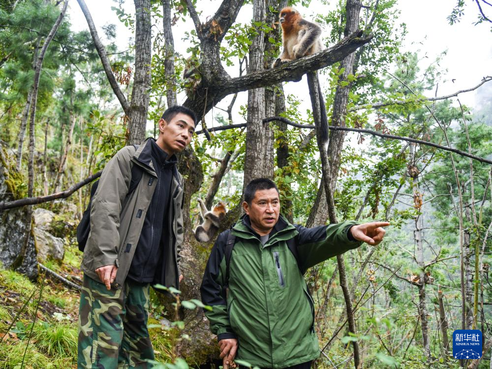 在四川白河國(guó)家級(jí)自然保護(hù)區(qū),唐玉林(右)向侄子唐小剛介紹川金絲猴的生活習(xí)性(10月11日攝)。新華社記者 王曦 攝