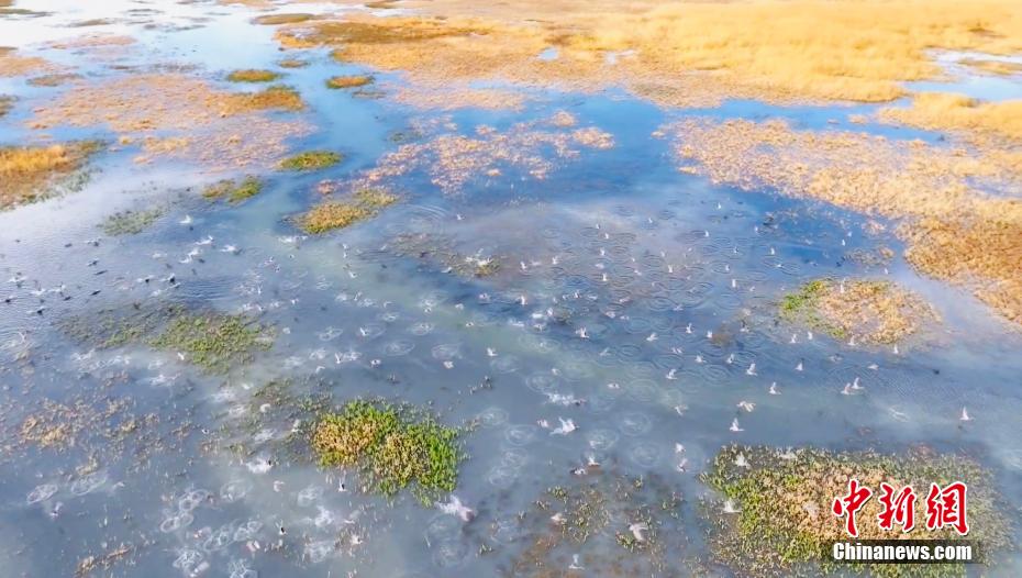 圖為無人機(jī)拍攝候鳥群在湖中飛舞。王小炯 攝