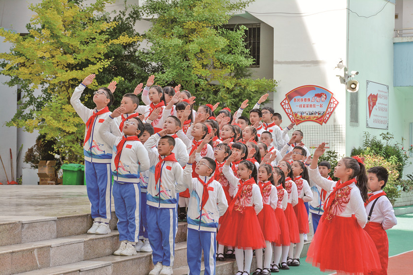 活躍提升組織生活也是少先隊工作強基固本的重要環(huán)節(jié)。通過健全少先隊階梯式成長激勵體系;全面實施分批入隊、分段教育、分級激勵和推優(yōu)入團;依托“紅領(lǐng)巾獎?wù)隆备采w隊中教育全過程等措施,全市14至15周歲新入團團員經(jīng)由少先隊組織推優(yōu)入團達100%。此外,全覆蓋開展“開學(xué)第一堂隊課”、主題隊課活動,規(guī)范舉行入隊儀式等,讓少先隊員組織意識和光榮感全面增強。
