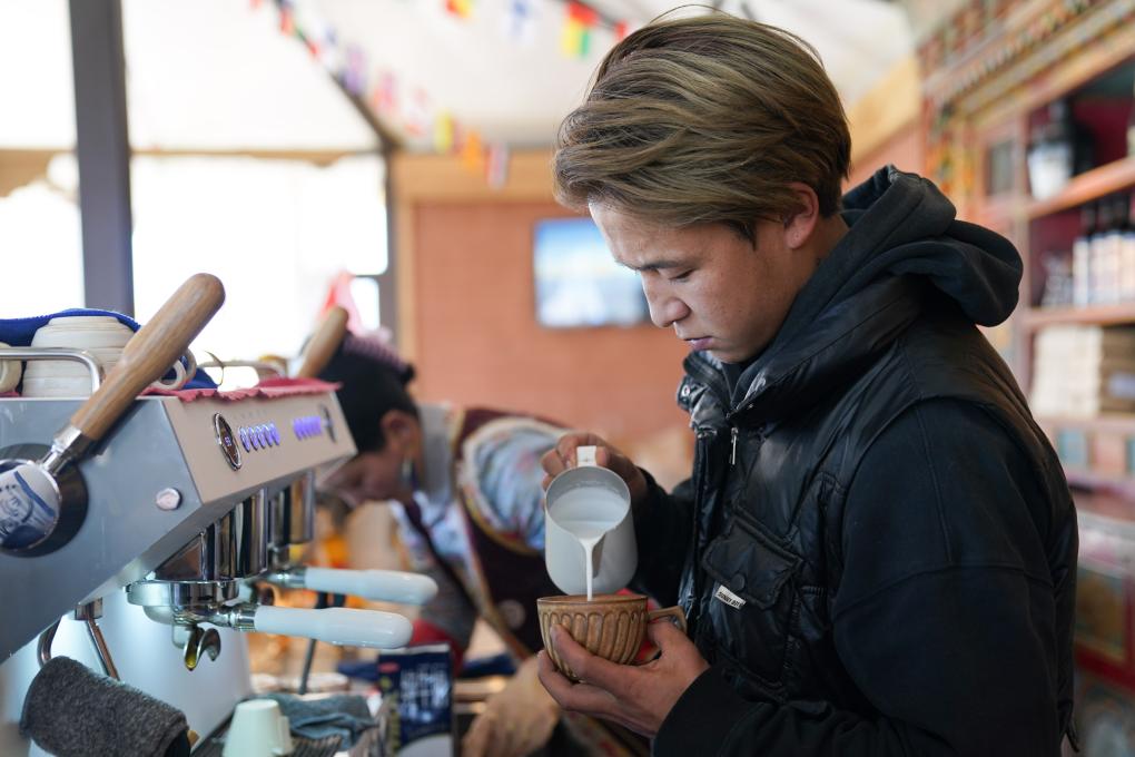 在四川省甘孜藏族自治州康定市的八郎生都村,達(dá)科在“云海咖啡屋”制作咖啡(10月28日攝)。