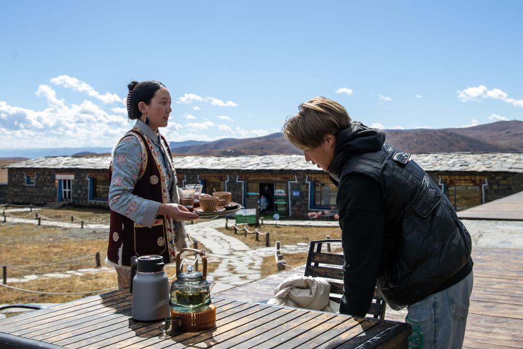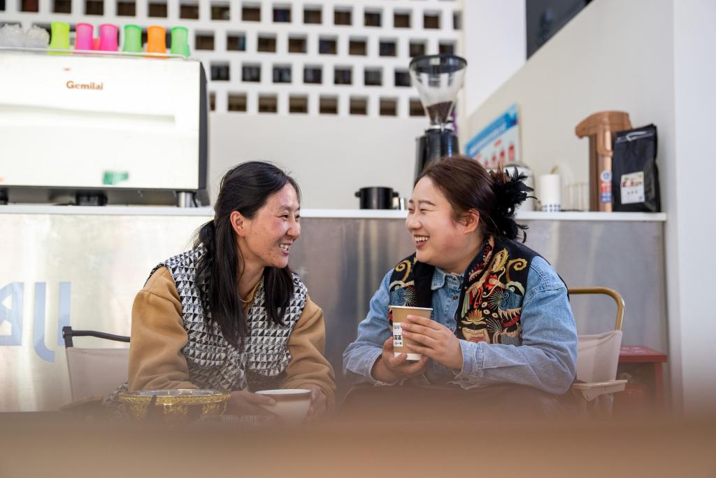 在四川省甘孜藏族自治州巴塘縣,劉莎莎在巴塘縣社會(huì)力量發(fā)展中心集群與咖啡廳的負(fù)責(zé)人格秋曲珍聊天(11月5日攝)。