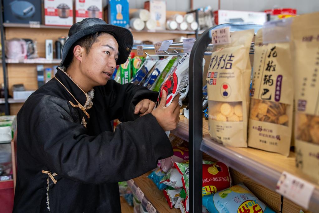 在四川省甘孜藏族自治州理塘縣甲洼鎮(zhèn),達(dá)洼在自家的超市整理商品(11月3日攝)。