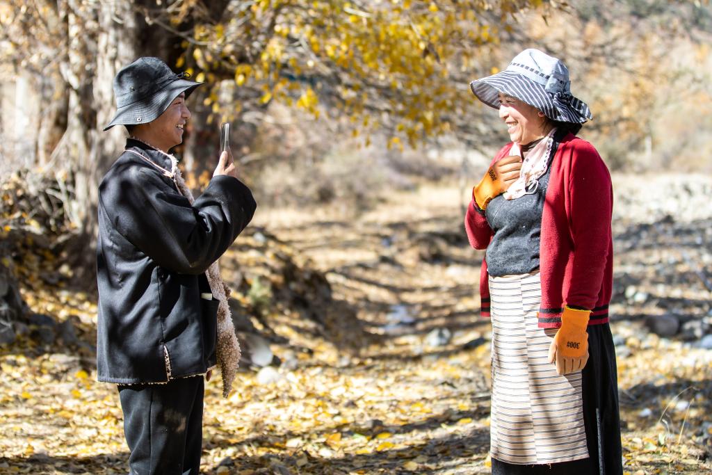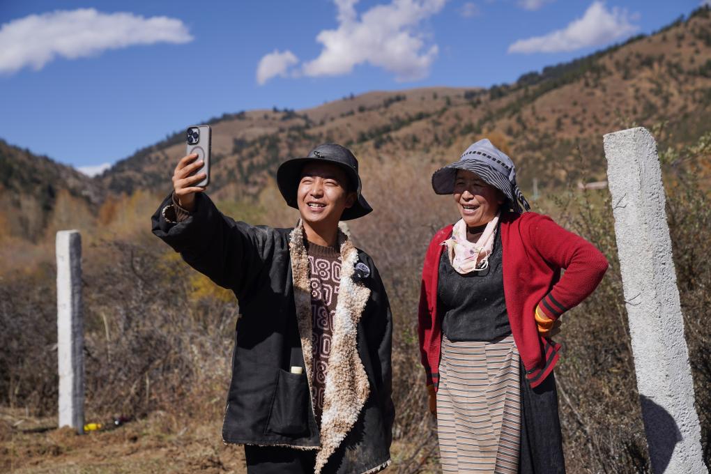 在四川省甘孜藏族自治州理塘縣甲洼鎮(zhèn),達(dá)洼(左)和媽媽一同拍攝視頻(11月3日攝)。