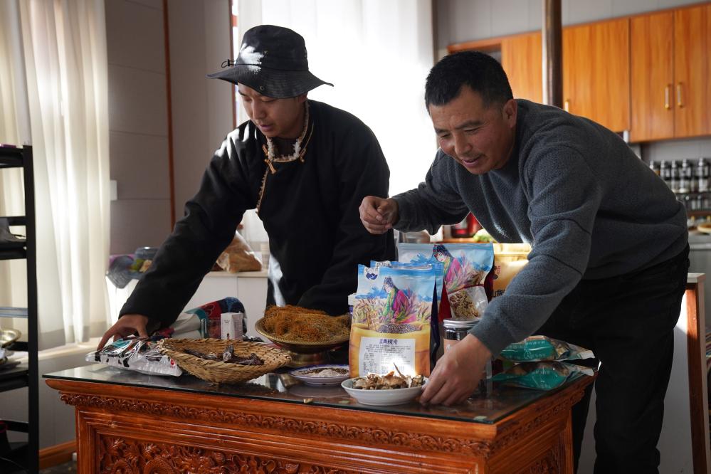 在四川省甘孜藏族自治州理塘縣甲洼鎮(zhèn),達(dá)洼(左)和爸爸為當(dāng)天的直播做準(zhǔn)備(11月3日攝)。