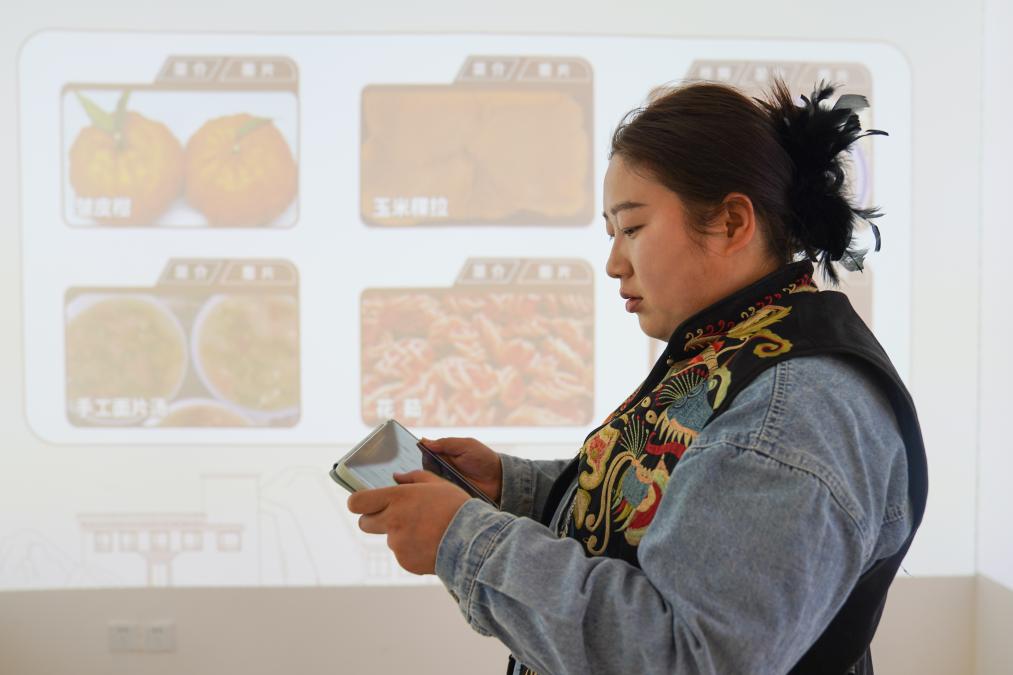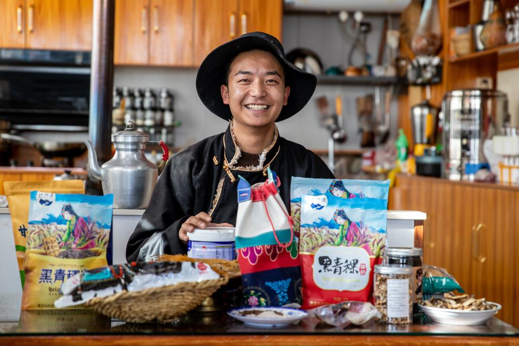 在四川省甘孜藏族自治州理塘縣甲洼鎮(zhèn),達(dá)洼在展示直播售賣的商品(11月3日攝)。