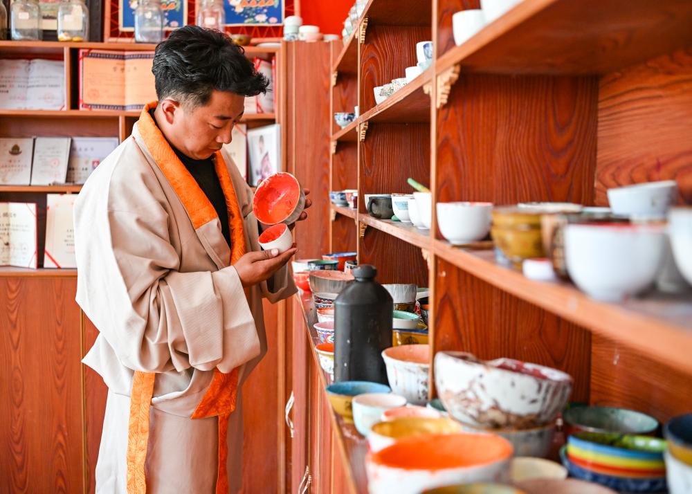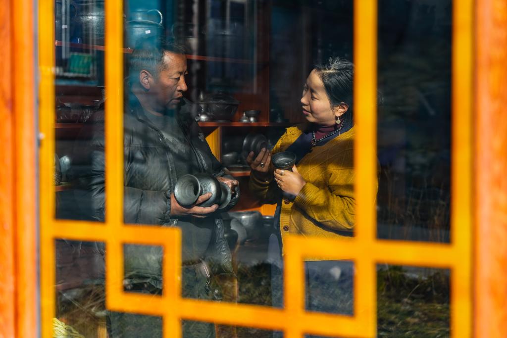 在德格縣麥宿鎮(zhèn)的扎堪倉黑陶工坊,達(dá)瓦卓瑪(右)向工坊主理人降擁格乃了解工坊近期的經(jīng)營情況以及新品研制進(jìn)展(11月4日攝)。達(dá)瓦卓瑪經(jīng)常會(huì)與麥宿鎮(zhèn)的其他手工藝者交流經(jīng)營中遇到的問題,想辦法幫他們解決。