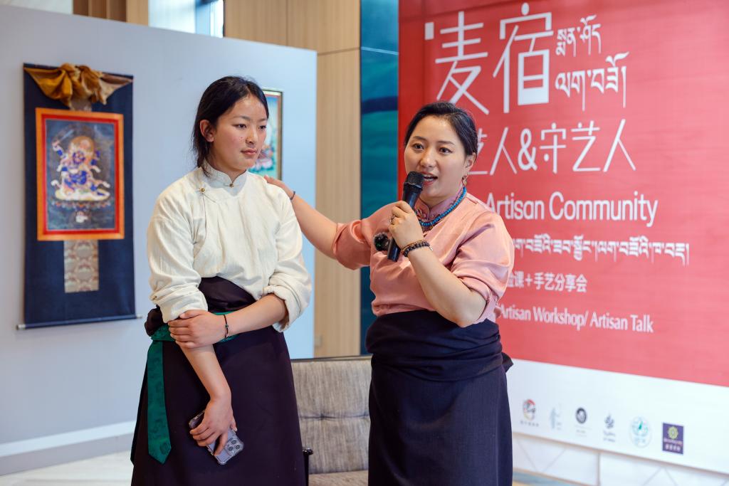 在四川省成都市寬窄巷子附近的皋月畫廊舉辦的“麥宿集市”上,達(dá)瓦卓瑪(右)向觀眾介紹麥宿年輕的手工藝者(2024年5月17日攝)。