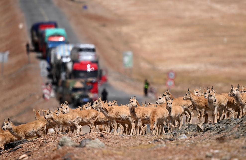 5月27日,藏羚羊在可可西里五道梁地區(qū)通過青藏公路。新華社記者 張龍 攝