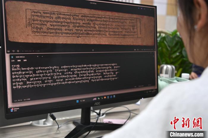 2月27日,在甘肅甘南藏族自治州碌曲縣益西達吉科技有限公司內,工作人員正在進行藏文古籍數字化相關工作。九美旦增 攝