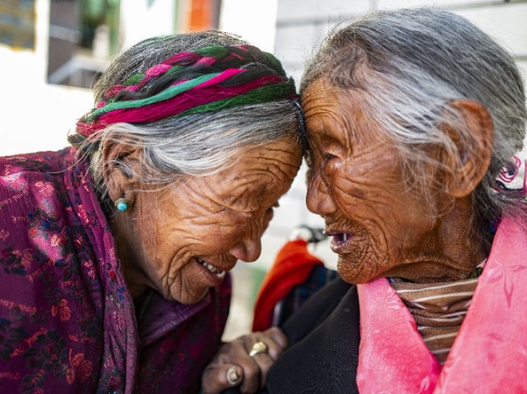 在西藏山南市加查縣熱果村,109歲的索朗卓瑪(右)和妹妹次仁行碰頭禮。記者 普布扎西 攝