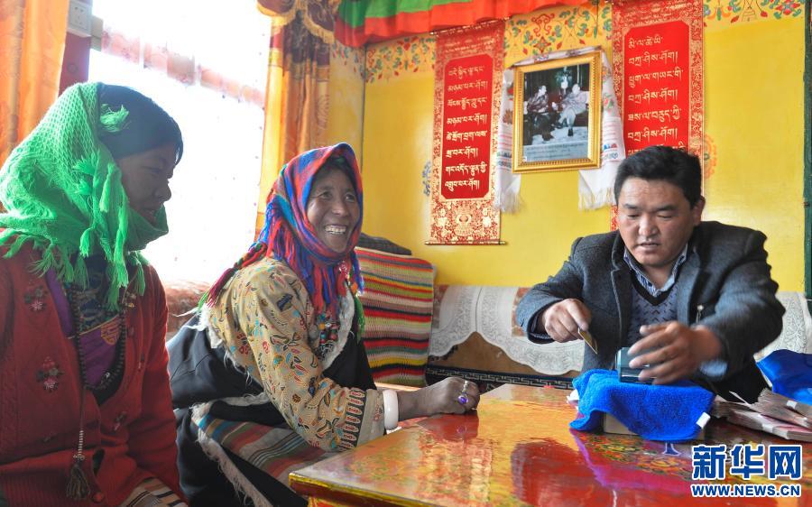 西藏日喀則市薩嘎縣達吉嶺鄉(xiāng)薩嘎村牧民在助農(nóng)取款服務(wù)點刷卡取款(2014年4月27日攝)。新華社記者 普布扎西 攝