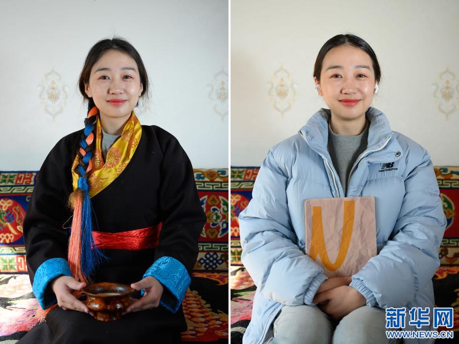 拼版照片:左圖為2月12日,在西藏自治區(qū)山南市乃東區(qū),格央身著傳統(tǒng)藏裝,手捧一碗酥油茶;右圖為2月12日,在西藏自治區(qū)山南市乃東區(qū),格央身著羽絨服,手持一臺(tái)平板電腦。新華社記者 劉金海 攝