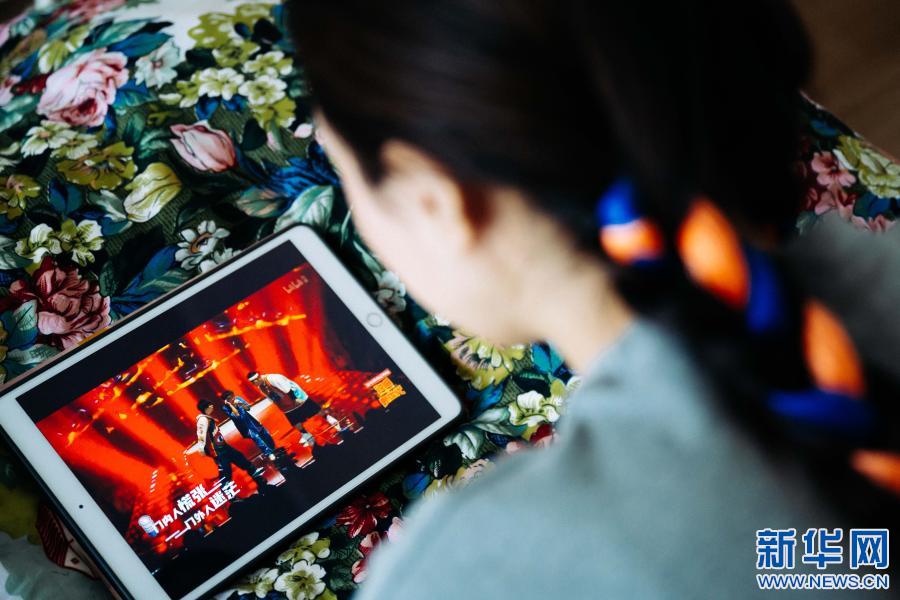 2月10日,在西藏自治區(qū)山南市乃東區(qū),格央在自己房間里使用平板電腦觀看《說(shuō)唱新世代》視頻片段。新華社記者 劉金海 攝